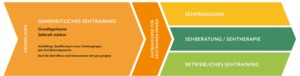 Ein Team von qualifizierten Trainerinnen aus dem Bereich Sehtraining, Optik, Naturheilkunde, Kinesiologie und Cranio Sacrale Therapie garantiert einen hohen Wissenstransfer. Die Ausbildung ist in 3 Blöcken aufgebaut, mit den Schwerpunkten die Basics im Sehtraining, natürliche Sehentwicklung, Augenerkrankungen und Gesundes Sehen am Bildschirm. Fachfortbildungen aus den Bereichen Optik, betrieblichem Sehtraining und Sehberatung bzw. -therapie vertiefen nach der Zertifizierung das Wissen der Sehtrainer*innen. Für die weitere berufliche Entwicklung sind dies wertvolle Module.